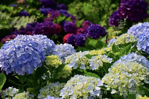 Pink, blue, and crimson hydrangeas across the branches. [Photo/WeChat account of Shuangshuang Guiyang, Pinzhi Baiyun]